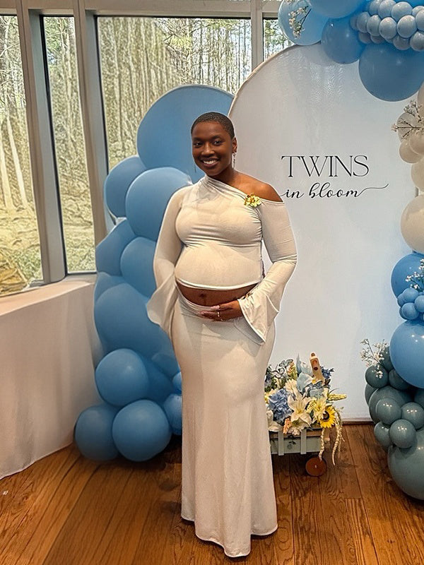 Momnfancy 2-in-1 Mermaid Oblique Shoulder Trailing Baby Shower Maternity Maxi Dress