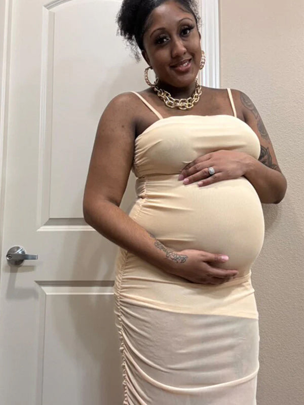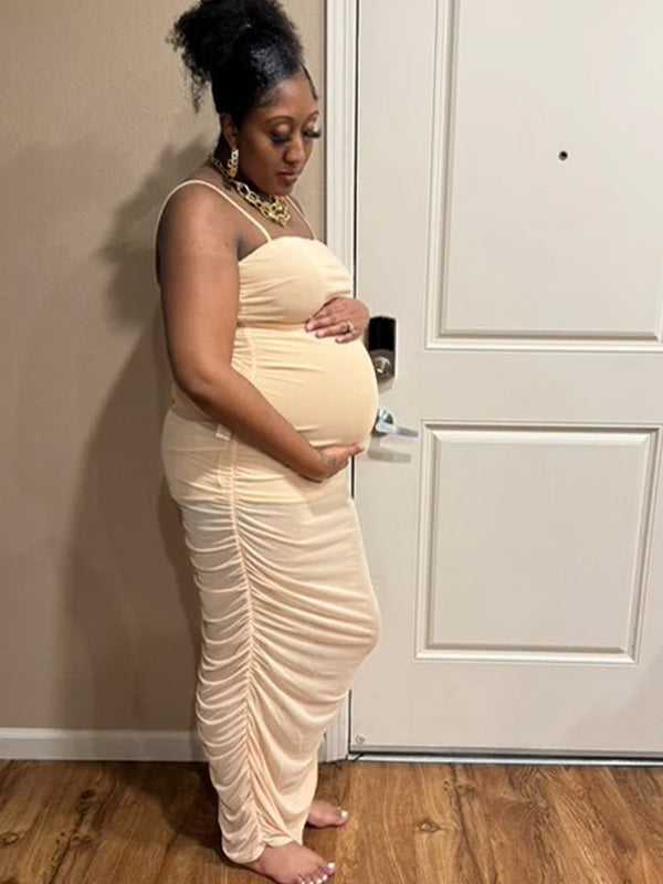 A tulle maternity dress with pleats on both sides, adjustable thin straps, and a built-in lining.