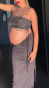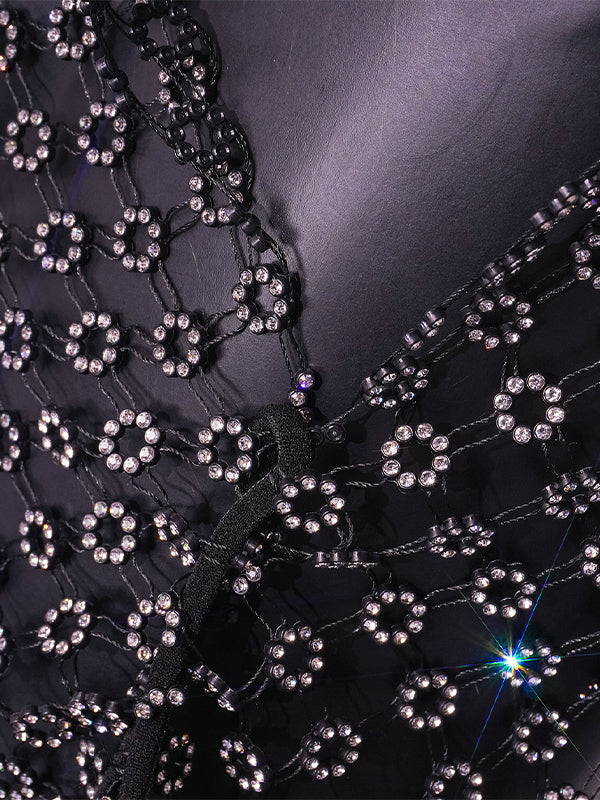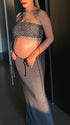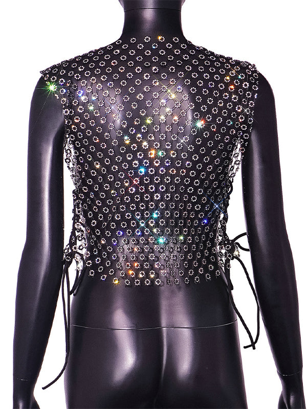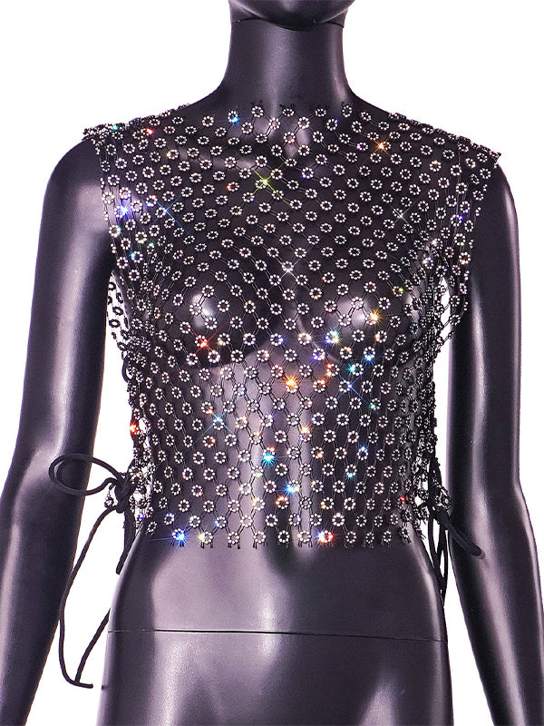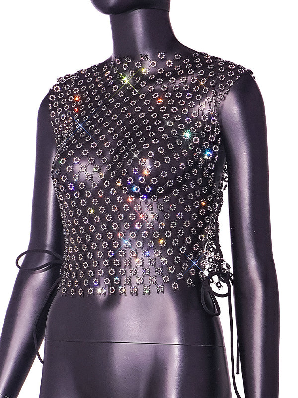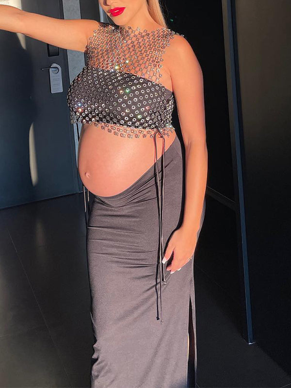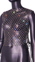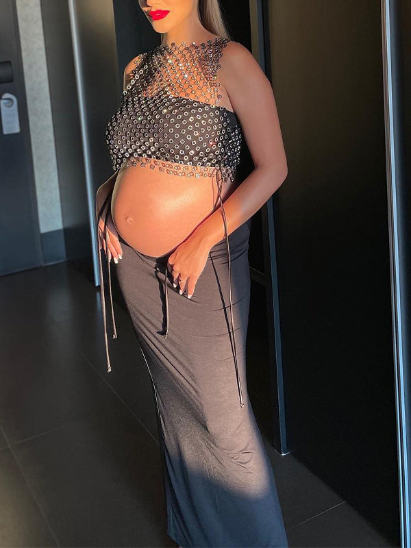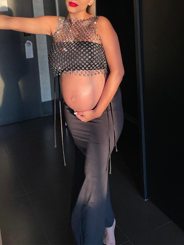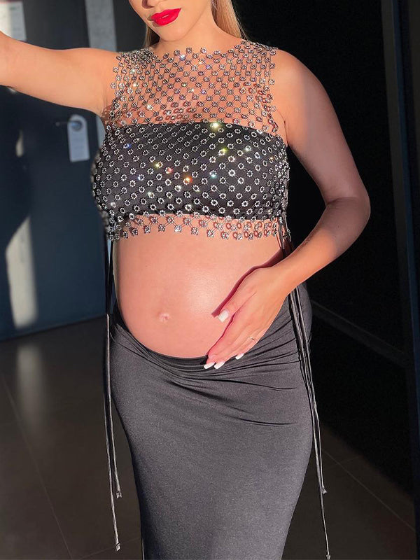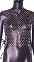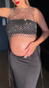 Momnfancy Black Diamond Mesh Fishnet Sheer Drawstring Chic Club Photoshoot Baby Shower Crop Top