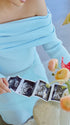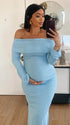 Momnfancy Blue Knit Ruched Off Shoulder Flare Sleeve Bodycon Elegant Cocktail Party Gown Maternity Photoshoot Baby Shower Maxi Dress