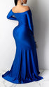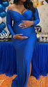 Momnfancy Blue Off Shoulder Long Sleeve High Split Bodycon Solid Baby Shower Party Gown Maternity Maxi Dress