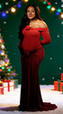 Momnfancy Christmas Off Shoulder Ruffle Boat Neck 3D-flowers Bodycon Photoshoot Maternity Maxi Dresses