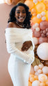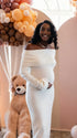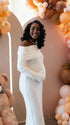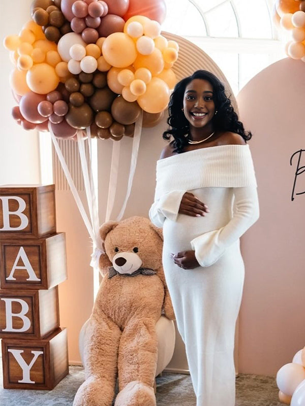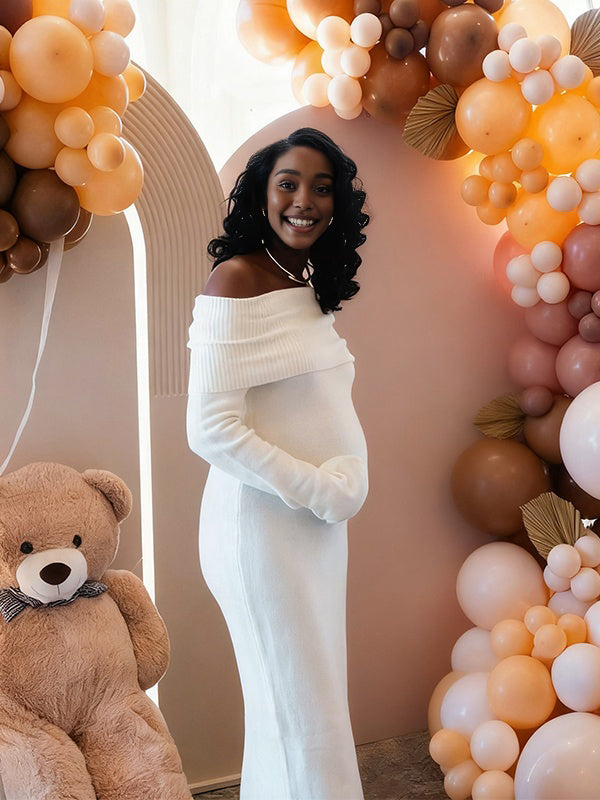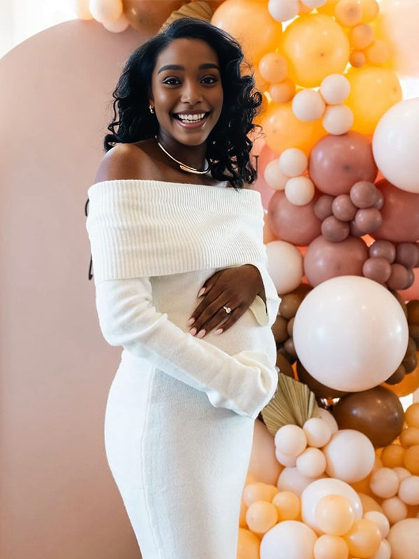 Momnfancy Boat Neck Bodycon Knitted Side Slit Off-shoulder Maternity Maxi Dress This white knitted maternity dress features versatile styling with a convertible boat neckline that transforms to an off-shoulder look, while the side slit adds a touch of allure with every step. The bodycon silhouette gracefully highlights your pregnancy curves, and the soft knit ensures cloud-like comfort throughout the day. The pristine white hue radiates pure elegance, with stretch fabric that gently adapts to your changing shape. Perfect for romantic dinners, gatherings with friends, weekend outings, or maternity photoshoots, this dress will have you looking effortlessly chic on every occasion.