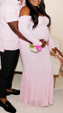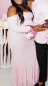 Embrace fairy-tale romance in this pink off-shoulder mermaid gown, featuring all-over lace embroidery and flowing flare sleeves that create an ethereal silhouette. The stretch lace fabric with strategic ruching gently supports your growing bump while maintaining a flawless fit. Designed with a graceful mermaid hem that flares below the knees, this dress moves with elegant fluidity. The soft pink hue and delicate lace details make it perfect for wedding receptions, baby showers, anniversary celebrations, and any special occasion where you want to feel like a radiant mermaid princess.