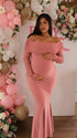 Momnfancy Boat Neck Mermaid Solid Color Bodycon Baby Shower Maternity Maxi Dress creates an elegant maternity look in soft pink with a classic boat neckline. The mermaid hem flows gracefully with movement, while the form-fitting cut gently supports your bump and accentuates your curves. Made from stretchy, comfortable fabric, it ensures ease of wear during baby showers, gatherings, or romantic dates. Simply accessorize with pearl earrings and a clutch to elevate your style, helping you radiate feminine charm at every joyful occasion.