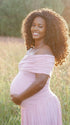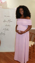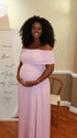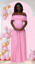 Momnfancy Boat Neck Off-shoulder Ruched Baby Shower Maternity Maxi Dress This pink maternity gown combines a classic boat neckline with convertible off-shoulder styling for a sweet and elegant party look. The neckline elongates your silhouette, while the adjustable shoulder design allows you to highlight your collarbone. The delicate ruching at the waist gracefully contours your pregnancy curves. Made from soft, stretch-lined fabric that gently supports your bump for all-day comfort. Perfect for baby showers, family gatherings, maternity photoshoots, or intimate celebrations, this dress will let you bloom with cherry blossom charm, ensuring you become the most captivating presence at any special occasion.