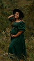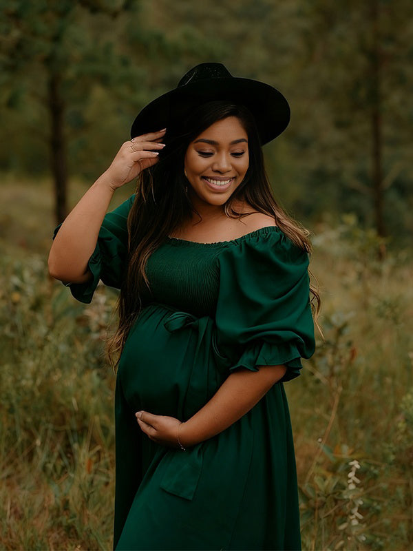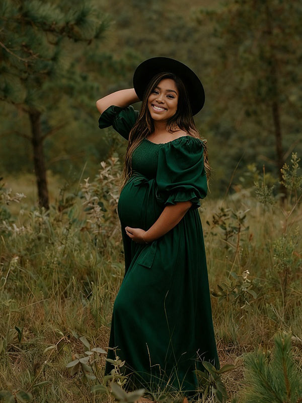 Momnfancy Bowknot Tightness Square Neck Splicing A-Line Maternity Maxi Dress showcases a deep green hue and elegant square neckline for a sophisticated maternity look. The delicate bow detail at the waist and A-line spliced skirt gracefully flatter your silhouette while accommodating your growing bump. Crafted from soft, flowing fabric, it ensures unrestricted comfort for everyday wear. Versatile enough for gatherings, family events, or semi-formal occasions, this dress pairs effortlessly with a simple handbag and flats to create a polished yet comfortable ensemble, helping you radiate effortless charm throughout your pregnancy journey.