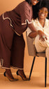 Skip the frumpy maternity wear—this buttery-soft chocolate knit set wraps your bump in stretchy, breathable fabric (perfect for trimesters 2–3). Crisp cream piping adds a designer touch; the relaxed top + wide-leg pants keep you cozy for errands and polished for baby showers. Timeless fit works post-pregnancy too. True to size, no tight seams.