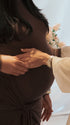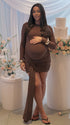 Momnfancy Brown Ruched Draped Lace-up Bodycon Long Sleeve Baby Shower Maternity Mini Dress combines an elegant brown hue with draped ruched detailing for a stylish and fitted maternity look. The adjustable lace-up waist allows for a customizable fit, while long sleeves and a mini length create a perfect balance of sophistication and playful charm. Made from stretchy, comfortable fabric, it gently hugs your bump and follows your curves with ease. Ideal for baby showers, casual gatherings, or date nights, this dress pairs effortlessly with ankle boots and delicate jewelry to create a chic ensemble that lets you shine with confidence during pregnancy.