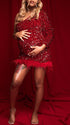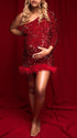 Momnfancy Burgundy Glitter Sequin Feather One Shoulder Bodycon Party Elegant Maternity Photoshoot Baby Shower Mini Dress