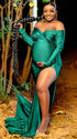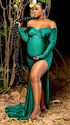 Momnfancy Green Off Shoulder Side Slit Banquet Photo Gown Photoshoot Maternity Evening Maxi Dress