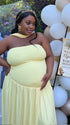 Momnfancy Light Yellow Bandeau Backless Ruched Side Slit Baby Shower Maternity Maxi Dress creates a radiant maternity look in soft yellow with a bandeau neckline and backless design. The delicate ruched detailing at the waist and high side slit work together to elongate your silhouette while adding a touch of sophisticated allure. Designed with a body-skimming cut and stretchy fabric, it comfortably supports your bump and allows for easy movement. Perfect for baby showers, summer gatherings, or maternity photoshoots, this dress pairs effortlessly with a straw bag and sandals to create a breezy, romantic vibe that lets you shine in the sunlight.