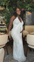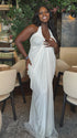 Momnfancy Open Back Plunging Neckline Ruched Halter Neck Maternity Maxi Dress creates a stunning maternity look in pure white with a daring plunging neckline and open-back design. The halter neckline frames graceful shoulders, while the deep V-front and back cut-out work in harmony, with ruched detailing providing gentle support for your bump. The form-fitting silhouette follows your curves flawlessly, and stretchy fabric ensures comfort during evening events or maternity photoshoots. Complete your ensemble with statement earrings and a metallic clutch to elevate your style, helping you shine with goddess-like radiance at every nighttime occasion.