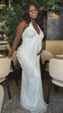 Momnfancy Open Back Plunging Neckline Ruched Halter Neck Maternity Maxi Dress