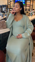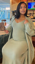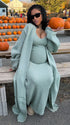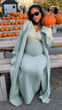 Momnfancy Solid Color Knitting V-Neck Bodycon Cardigan 2-in-1 Maternity Sweater Maxi Dress creates a versatile maternity ensemble in soft light blue knitted fabric. The V-neck slip dress paired with a matching cardigan showcases feminine curves while providing cozy warmth. The bodycon cut gently supports your bump, and the supple knit material ensures all-day comfort. Perfect for daily commutes, gatherings with friends, or spring and autumn outings, this set can be styled with white sneakers and a canvas tote for a effortlessly chic look that maintains elegance in changing weather conditions.