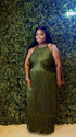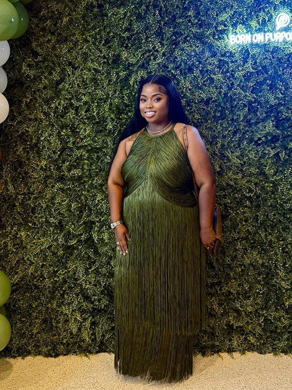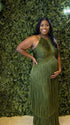Momnfancy Tassel Halter Neck Off-shoulder Party Photoshoot Maternity Maxi Dress features an elegant halter neckline and off-shoulder design with dynamic fringe details, creating a truly memorable party look. The fitted silhouette and stretchy fabric gently adapt to your changing body, while the flowing skirt adds grace and length. Rich green hue brings a touch of understated luxury, making it perfect for maternity photos, evening events, and special celebrations. Complete your glamorous ensemble with simple heels and a delicate clutch to shine with confidence at every sparkling occasion.