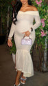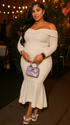 Momnfancy White Bowknot Off Shoulder Ruched Bodycon Evening Mermaid Gown Maternity Maxi Dress This white maternity evening gown combines a graceful off-shoulder neckline with a delicate bowknot detail for an enchanting banquet look. The shoulder-baring design highlights your collarbone and shoulders, while the bow adds a touch of sweet elegance. The bodycon silhouette beautifully contours your pregnancy curves, and the mermaid hem creates dramatic movement with every step. Made from soft, stretchy fabric that gently supports your bump for all-day comfort. Perfect for formal dinners, baby showers, wedding celebrations, or maternity photoshoots, this gown will make you shine with moonlit radiance, ensuring you become the center of attention at every special occasion.