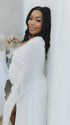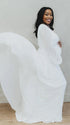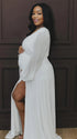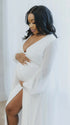 Momnfancy White Chiffon V-Neck Lantern Sleeve Side Slit Weeding Photoshoot Maternity Maxi Dress