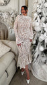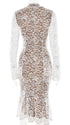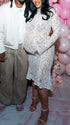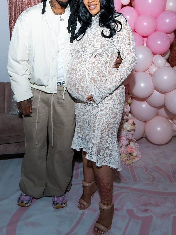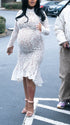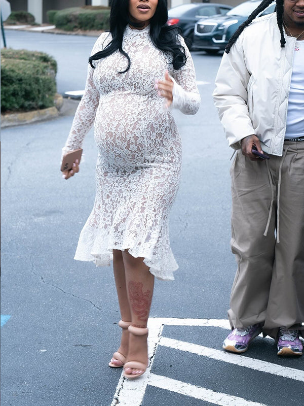 Momnfancy White Lace Ruffle Sheer Mermaid Flare Long Sleeve Sleeve Party Baby Shower Bodycon Maternity Midi Dress