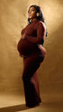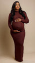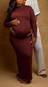 Momnfancy Wine Red Band Neck Long Sleeve Bodycon Basic Plus Size Photoshoot Maternity Maxi Dress