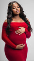 Momnfancy Wine Red Off Shoulder Backless Cut Out Mermaid Long Sleeve Bodycon Photoshoot Maternity Maxi Dress